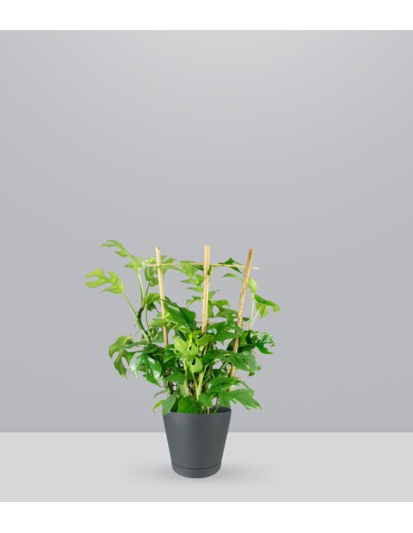 Questa Monstera minima presenta una spalliera di supporto che aiuta la crescita verticale della pianta.