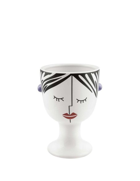La forma di calice del vaso offre una base solida per le piante, mentre il grazioso volto di donna stilizzato aggiunge un tocco artistico e unico, creando un bel contrasto di colori tra il bianco della ceramica e il nero e rosso del volto.