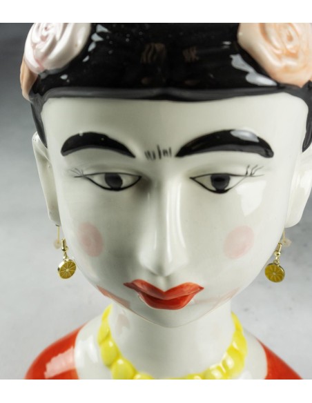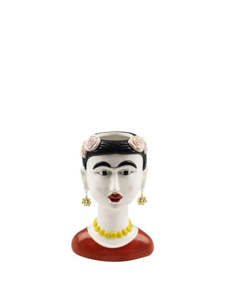 Raffinata è un vaso in ceramica a mezzobusto dipinto con un viso di donna che ricorda Frida Khalo, pittrice di ispirazione per molti artisti.