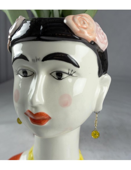 Sono Floreale, un bellissimo vaso in ceramica dipinto, con la forma di un mezzobusto di donna molto caratteristico e somigliante alla pittrice Frida Khalo!