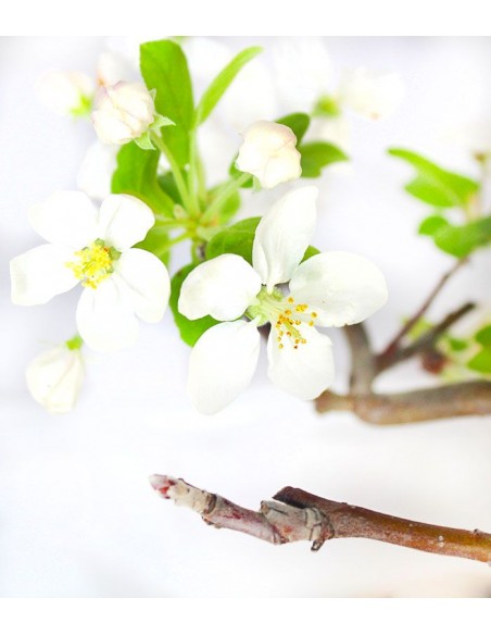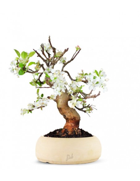 La meraviglia del bonsai di melo sono: la grande quantità di fiori bianchi e la produzione di frutti.