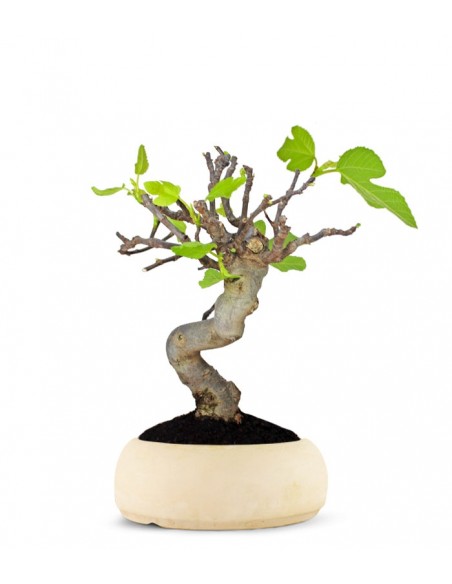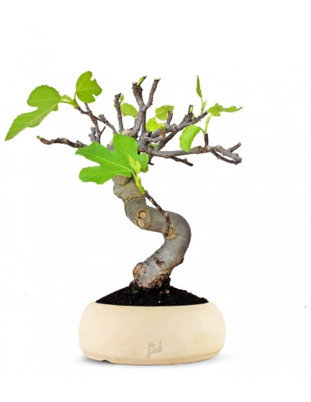 Ficus carica: un bonsai dall'innegabile valore ornamentale, grazie alla sua presenza maestosa, generosa ma elegante. L'appellativo 'carica' è dovuto alla Caria, regione dell'Asia minore della quale è originario, anche se oggi grazie alla sua grande versatilità, è altamente diffuso in tutto il bacino del mediterraneo. Le foglie, rugose e spesse, presentano una lamina che ricorda il palmo di una mano con il margine lievemente irregolare. Una marcata nervatura le attraversa e un succo latteo velenoso scorre dentro di esse. Quelli che comunemente vengono considerati i frutti, in realtà sono delle infiorescenze carnose, le quali, dopo essere state fecondate, diventano infruttescenze. In ogni caso, qualunque sia il loro nome, sono sempre buonissimi da mangiare. Un'essenza mai banale che grazie alla sua rusticità si sviluppa molto bene in qualsiasi ambiente venga posto.