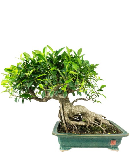 Questo esemplare si presenta con foglio lucide e coriacee, tipiche del Ficus Retusa, e un tronco massiccio, che racconta una storia di anni di crescita e formazione. Le radici sono ben sviluppate e visibili.