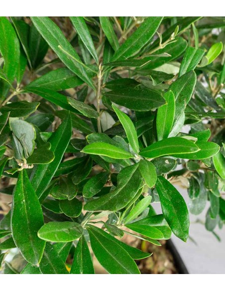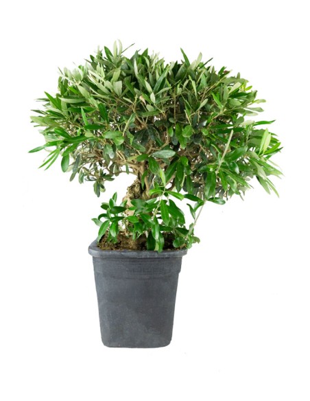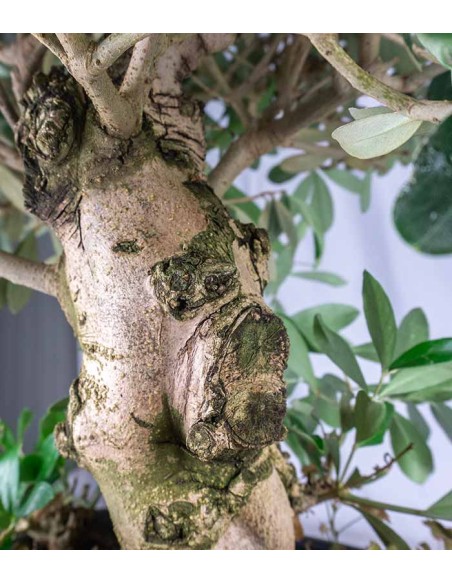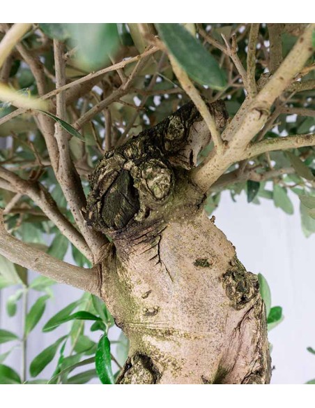 Il tronco dell'olivo bonsai, con il passare degli anni, sviluppa un aspetto nodoso e una corteccia screpolata che conferiscono alla pianta un fascino unico e antico. Le foglie dell'olivo bonsai sono ovoidali e di un colore verde argentato. L'olivo bonsai produce anche piccole olive commestibili, che aggiungono un tocco di autenticità alla pianta.