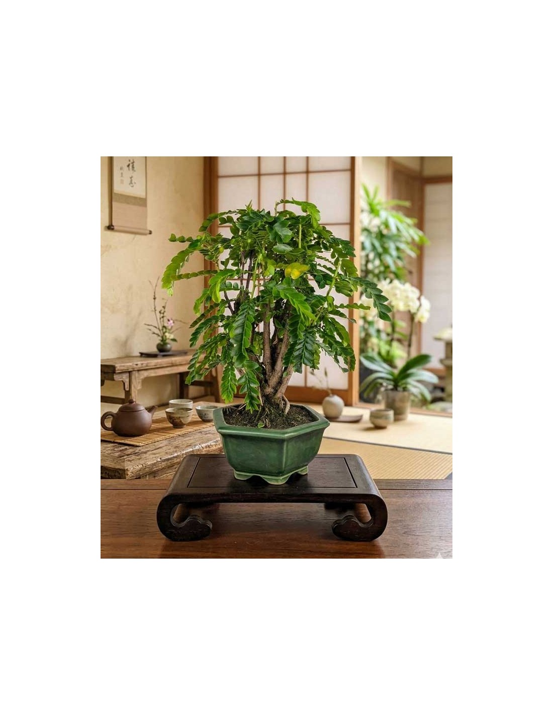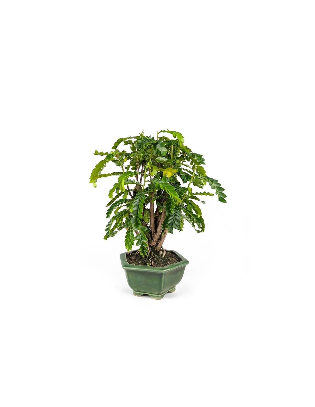 Quando viene coltivato come bonsai, l'albero tamarindo sviluppa una chioma compatta e una ramificazione armoniosa che valorizza la forma naturale della pianta.