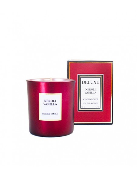 Candela profumata neroli e vaniglia dal design essenziale ed allo stesso tempo elegante: box in cartoncino con una raffinati dettagli dorati; vetro di colore rosso opaco dallo stile moderno e lineare.