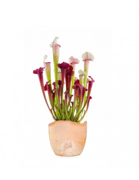 La Sarracenia spicca tra le piante carnivore per il rosa brillante delle sue foglie arrotolate a cono, splendide e temibili trappole per gli insetti. Appariscente e stravagante, con il suo carattere deciso impone la propria vistosa bellezza negli ambienti che la ospitano, donando loro personalità e stile. Si tratta di una specie facile da curare, che ha bisogno di un elevato grado di umidità. Un sottovaso con dell'acqua demineralizzata o piovana, ma mai calcarea, è un eccellente base per accoglierla e per mantenere costantemente umidificate le sue radici. Occorre però ricordarsi di eliminare il sottovaso durante l'inverno, nel corso del periodo vegetativo. In qualsiasi stagione dell'anno è invece buona norma nebulizzare le foglie, anche più volte al giorno, per avere la certezza di vedere crescere rigogliosa questa pianta carnivora. Naturalmente anche la luce ha la sua importanza: posizionate la pianta nei pressi di una finestra ben esposta al sole e ai suoi raggi diretti oppure sistematela sul balcone: la Sarracenia non teme i rigori invernali. Limitatevi eventualmente a proteggerla con del tessuto non tessuto solo se le temperature scendono al di sotto dello zero.
