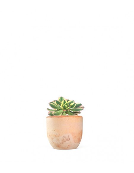 Il genere Aeonium comprende tutte quelle succulente con il classico aspetto “a rosetta” e che con la crescita assumono le apparenze di un piccolo arbusto. Nel caso dell'Aeonium arboreum variegato, le foglie assumono una deliziosa bordatura giallo-rosacea che la vivacizza in modo evidente. Sono foglie tipiche del genere Aeonium, quindi concave nella parte alta, al contrario del genere Echeveria in cui si presentano convesse sia nella pagina superiore che in quella inferore. I colori di questo Aeonium si fanno ancora più notevoli se uniti al vaso Flob artigianale in terracotta. Dal centro della rosetta si sviluppano fiori di colore variabile. La particolarità è che dopo la fioritura la rosetta muore, avendo però lasciato già spazio ai lati per la crescita di nuove rosette.