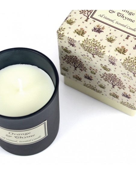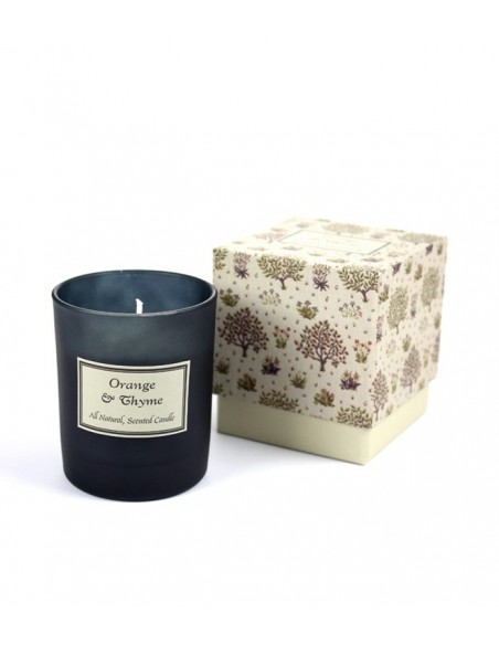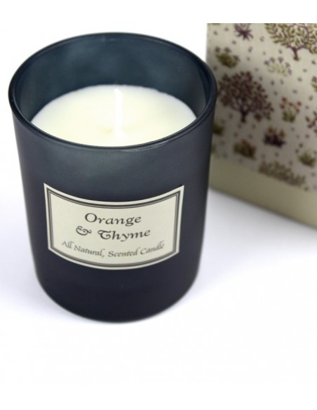 Candela profumata che accosta l'aroma agrumato dell'Arancia a quello delicato ed del Timo, nota pianta aromatica officinale che allevia le infiammazioni delle vie respiratorie e possiede proprietà digestive.
