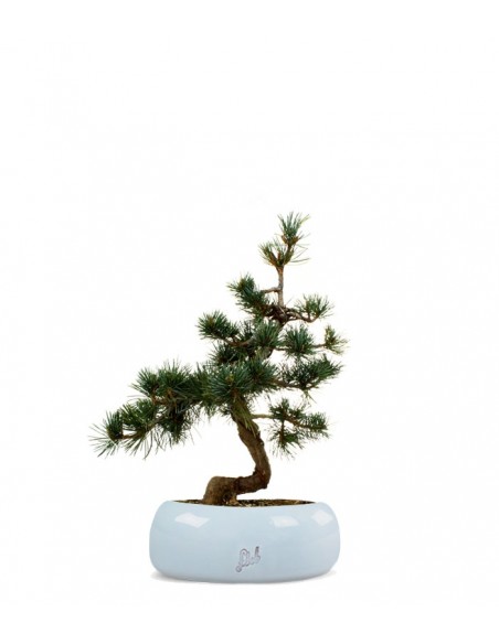 È una nota variante del Pino Parviflora ed è conosciuto anche come Pino a 5 aghi, Pino bianco e 'goya-matsu' in Giappone. In natura raggiunge i 25-30 m di altezza e rappresenta la conifera più utilizzata come bonsai. Ha un tronco eretto e tortuoso, una chioma di forma piramidale folta e ben ramificata e aghi di colore verde-azzurro che si uniscono a gruppi di 5, da cui il nome. Esiste anche una sottospecie con aghi verdi più corti e sottili chiamata 'Kokonoe'. Ama luoghi soleggiati e ben ventilati e non teme né il caldo né il freddo, sebbene, in caso di gelo, sia meglio coprire il vaso con tnt. Richiede annaffiature periodiche, soprattutto se tenuto all'interno, ma è importante evitare i ristagni d'acqua. La potatura va effettuata in inverno, il rinvaso ogni 3-5 anni. È una specie molto longeva, tanto da essere tramandata di generazione in generazione nei paesi d'origine, e diventa sempre più bella col passare del tempo. All'interno del National Arboretum di Washigton DC è custodito un esemplare di oltre 390 anni: il pino bianco fu donato agli Stati Uniti nel 1975 da Masaru Yamaki, un maestro bonsai, per le celebrazioni del bicentenario della fondazione degli USA.
