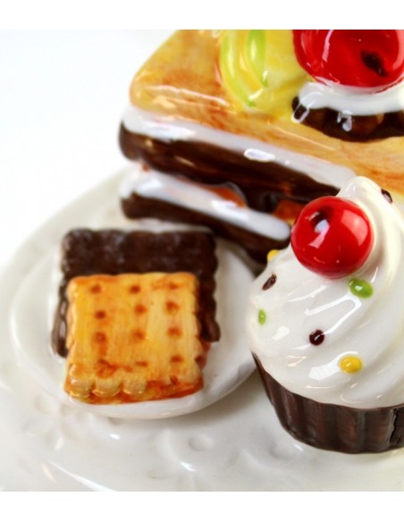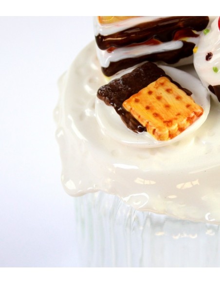 Vaso in vetro con coperchio in ceramica decorato a forma di biscotti e torta.