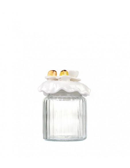 Vaso in vetro con coperchio in ceramica decorato con tortine.