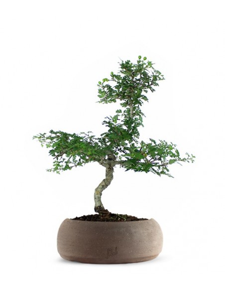Il biancospino, o Crataegus, è una pianta caducifoglia e latifoglia. Di origine asiatica, il Crateagus è presente in natura con oltre 200 varietà, ma quelle più adatte per i bonsai sono il Monogyna, l'Oxycantha e la Cuneata. Il fusto è coperto da una corteccia compatta di colore grigio. I rami più giovani riportano delle spine che si sviluppano alla base ed sono proprio questi rametti che si riempiono di fiori in primavera. Il biancospino ha molte proprietà benefiche utili a risolvere problemi cardiovascolari e riguardanti il sistema nervoso centrale. ? usato come ansiolitico ed è indicato per casi di insonnia. L'ampia diffusione in arte bonsai è determinata dal suo essere molto decorativo anche quando non è fiorito e dalla sua grande vigoria e dalla sua crescita molto rapida.
