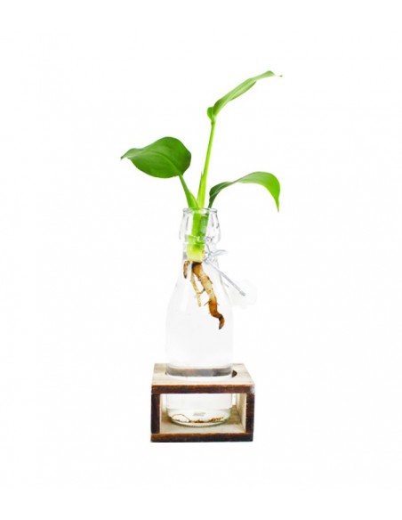 Il design rustico e naturale di questa bottiglia in vetro sorretta da un supporto in legno esalta le foglie verdi e lucide del filodendro contenuto al suo interno. Un oggetto dalla linea assolutamente minimal che vi consentirà di ammirare lo sviluppo delle sue radici aeree e di donare un tocco green alla vostra casa. Un complemento d'arredo originale, ideale per essere inserito in qualsiasi ambiente, da solo oppure abbinata ad altre bottiglie della stessa collezione.