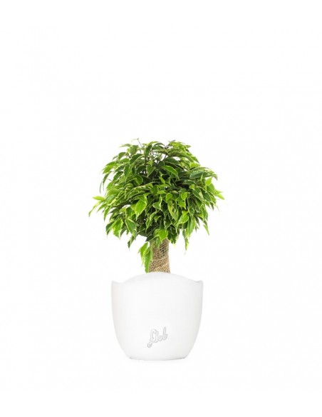 Il Ficus benjamin Kinky non mancherà di stupire chiunque lo guardi: l'aspetto di un alberello in miniatura, in questa varietà “a tronchetto”, risulta molto grazioso per questo Ficus benjamin, che presenta eleganti variegature sul bordo delle foglie, di colore giallo chiaro. Si tratta ormai di un punto saldo nel mondo delle piante d'appartamento: la sua diffusione ormai tocca qualsiasi parte del mondo, per la facilità di coltivazione e per le importanti proprietà di assorbire elementi inquinanti nell'aria. Il ficus beniamino si adatta quindi molto bene ad interni come case e uffici, dove è importante avere un'atmosfera sana per evitare il più possibile le classiche patologie dell'apparato respiratorio.
