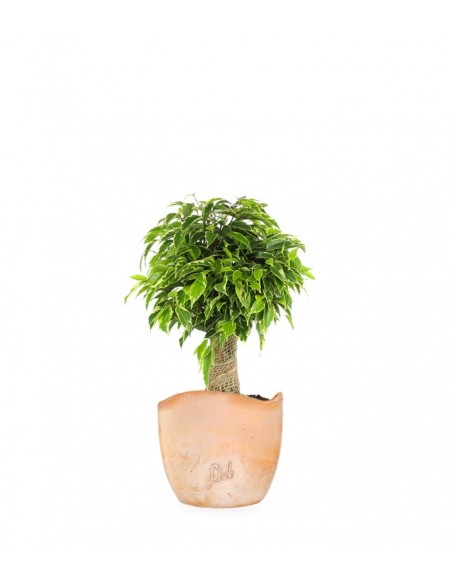 Il Ficus benjamin Kinky non mancherà di stupire chiunque lo guardi: l'aspetto di un alberello in miniatura, in questa varietà “a tronchetto”, risulta molto grazioso per questo Ficus benjamin, che presenta eleganti variegature sul bordo delle foglie, di colore giallo chiaro. Si tratta ormai di un punto saldo nel mondo delle piante d'appartamento: la sua diffusione ormai tocca qualsiasi parte del mondo, per la facilità di coltivazione e per le importanti proprietà di assorbire elementi inquinanti nell'aria. Il ficus beniamino si adatta quindi molto bene ad interni come case e uffici, dove è importante avere un'atmosfera sana per evitare il più possibile le classiche patologie dell'apparato respiratorio.