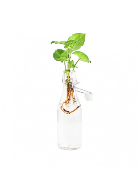 Una versione di Singonio a “radice nuda” inserita all'interno di una bottiglia in vetro dall'aspetto rustico e naturale. Questa pianta proviene dall'America centrale e meridionale e presenta foglie molto particolari di forma allungata e di colore verde chiaro variegate di bianco, giallo e verde scuro. Il risultato è un oggetto ornamentale che donerà un tocco di stile alla vostra casa. Un complemento d'arredo originale che rende questa pianta di Syngonium ideale per essere inserita in qualsiasi ambiente, da sola oppure abbinata ad altre bottiglie della stessa collezione. L'effetto sarà davvero spettacolare e molto decorativo!