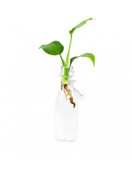 Il design rustico e naturale di questa bottiglia in vetro con all'interno una piccola pianta di filodendro vi consentirà di aggiungere un tocco decorativo ai vostri ambienti. Il verde intenso delle foglie lisce e lucide contrastano con il vetro del vaso e creano un gioco di equilibri. Un oggetto dalla linea assolutamente minimal che vi consentirà di ammirare lo sviluppo delle radici aeree di questa pianta. Un complemento d'arredo originale, ideale per essere inserito in qualsiasi ambiente, da solo oppure abbinata ad altre bottiglie della stessa collezione.