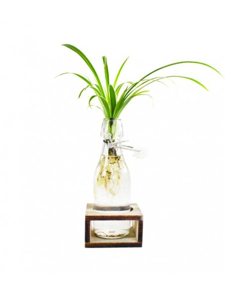 Si tratta di una pianta proveniente dall' Africa meridionale che presenta foglie lunghe di colore verde brillante con striature bianche o gialle. In questo caso ritroviamo il Clorofito all'interno di una bottiglia in vetro dall'aspetto rustico e naturale sorretta da una base in legno. Un complemento d'arredo che vi consentirà di ammirare lo sviluppo delle sue radici e che rende questa pianta ideale per essere inserita in qualsiasi ambiente, da sola oppure abbinata ad altre bottiglie della stessa collezione. L'effetto sarà davvero spettacolare e molto decorativo!