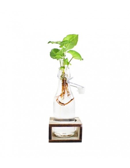 Una versione di Syngonium a “radice nuda” inserita all'interno di una bottiglia in vetro dall'aspetto rustico e naturale sorretta da un supporto in legno. Questa pianta presenta foglie molto particolari di forma allungata e di colore verde chiaro variegate di bianco, giallo e verde scuro. Il risultato è un oggetto ornamentale che donerà un tocco di stile alla vostra casa. Un complemento d'arredo originale che rende questa pianta di Syngonium ideale per essere inserita in qualsiasi ambiente, da sola oppure abbinata ad altre bottiglie della stessa collezione. L'effetto sarà davvero spettacolare e molto decorativo!