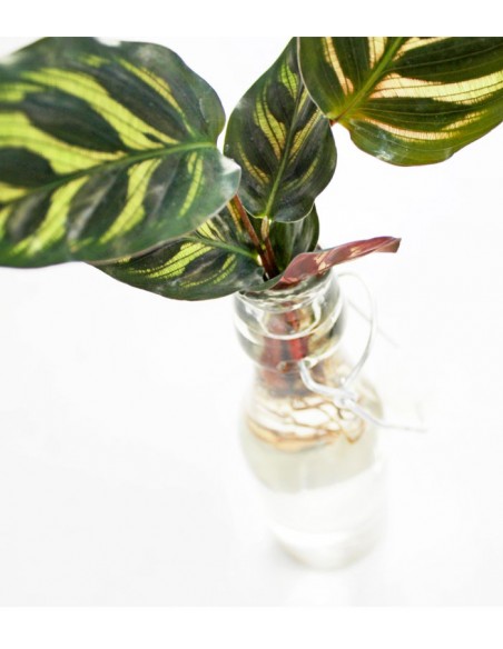 Una versione di Calathea a “radice nuda” inserita all'interno di una bottiglia in vetro dall'aspetto rustico e naturale. Questa pianta proviene dalle foreste dell'Amazzonia sudamericana, dove cresce all'ombra della fitta vegetazione. Presenta un fogliame molto ornamentale con foglie caratterizzate disegni verde scuro che ricordano le piume del pavone; la pagina inferiore presenta invece colori vivaci tendenti al rosa o al porpora. Il risultato è un oggetto dalla linea assolutamente minimal che vi consentirà di ammirare lo sviluppo delle sue radici aeree. Un complemento d'arredo originale che rende questa pianta di Calathea ideale per essere inserita in qualsiasi ambiente, da sola oppure abbinata ad altre bottiglie della stessa collezione. L'effetto sarà davvero spettacolare e molto decorativo!