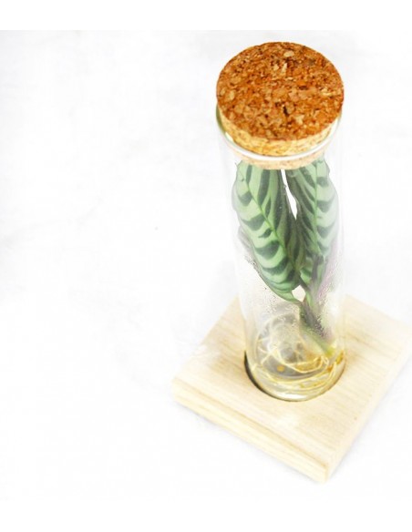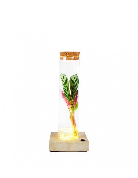 La Calathea è una pianta erbacea perenne appartenente alla famiglia delle Marantaceae, originaria del Brasile orientale. In questo caso si trova inserita all'interno di un barattolo in vetro dall'aspetto rustico e naturale appoggiato su di un supporto in legno chiaro con un led all'interno. La luce mette in risalto il fogliame molto ornamentale della calathea, caratterizzato da disegni verde scuro che ricordano le piume del pavone; la pagina inferiore presenta invece colori vivaci tendenti al rosa o al porpora. Il risultato è un complemento d'arredo originale che rende questa pianta di Calathea ideale per essere inserita in qualsiasi ambiente, da sola oppure abbinata ad altre bottiglie della stessa collezione. L'effetto sarà davvero spettacolare e molto decorativo!