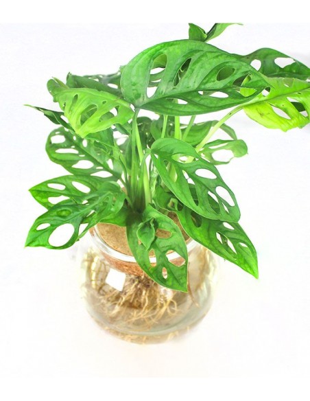 Le piante in idrocoltura in vasi di vetro sono ormai un vero trend nelle case e nei reportage di interni. In questo caso si tratta di un filodendro monkey mask, una pianta sempreverde e rampicante, originaria delle zone tropicali dell'America centrale e meridionale. Presenta foglie di colore verde intenso lucido con lamina perforata in modo regolare o irregolare. Deve il suo nome proprio al fogliame particolare che ricorda la faccia di una scimmia. Un oggetto dal design essenziale ma al contempo particolare, con il quale potrete donare all'arredamento di casa un'atmosfera tropicale. Il colpo d'occhio sarà assicurato. Aggiungiamo inoltre che il filodendro monkey mask è nella top 10 delle pianta in grado di migliorare la qualità dell'aria che respiriamo e limitare l'inquinamento domestico. Filtra molti agenti inquinanti tra cui la formaldeide, presente nei tappeti, nei mobili e nei prodotti per la pulizia della casa, efficace contro le onde elettromagnetiche