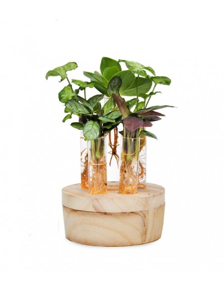 Chi ama la natura non è mai sazio di carpirne la meraviglia e scoprirne nuove prospettive! Questo mix di piante in idroponica rappresenta dunque un interessante complemento d'arredo che combina perfettamente il mondo green e il design. Risulta composto di 6 piante coltivate con la tecnica dell'idrocoltura inserite all'interno di vasetti in vetro. Questi ultimi sono posizionati su di una base con luce a led incorporata che mette in risalto il fogliame e le radici nude di queste piantine che sono clusia, calathea e syngonium.