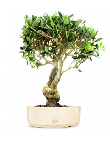 Le specie di olivo bonsai sono moltissime e differiscono soprattutto nella produzione dei frutti, mentre nella struttura, che è quello che interessa il bonsaista, sono tutte abbastanza simili, con lievi differenze di dimensioni. Qui ti proponiamo l'olivo bonsai XXL: deve il suo nome alle sue notevoli dimensioni rispetto alle altre varietà, visto che ha un'altezza dalla base del vaso di 55 centimetri. È sicuramente il più elegante tra i bonsai di olivo, grazie al suo tronco nodoso che gli conferisce un'aria di antichità.