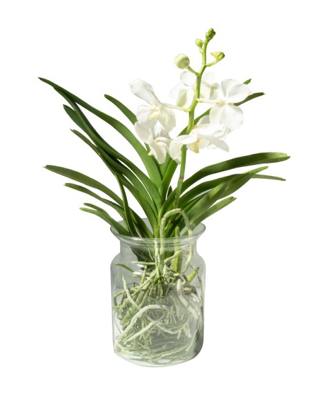 La nostra orchidea Vanda, alta 45 cm, è fornita con un vaso di vetro trasparente che permette di apprezzarne la bellezza da ogni angolazione. L'orchidea Vanda è una pianta facile da curare, che richiede solo una corretta esposizione alla luce e una regolare irrigazione.