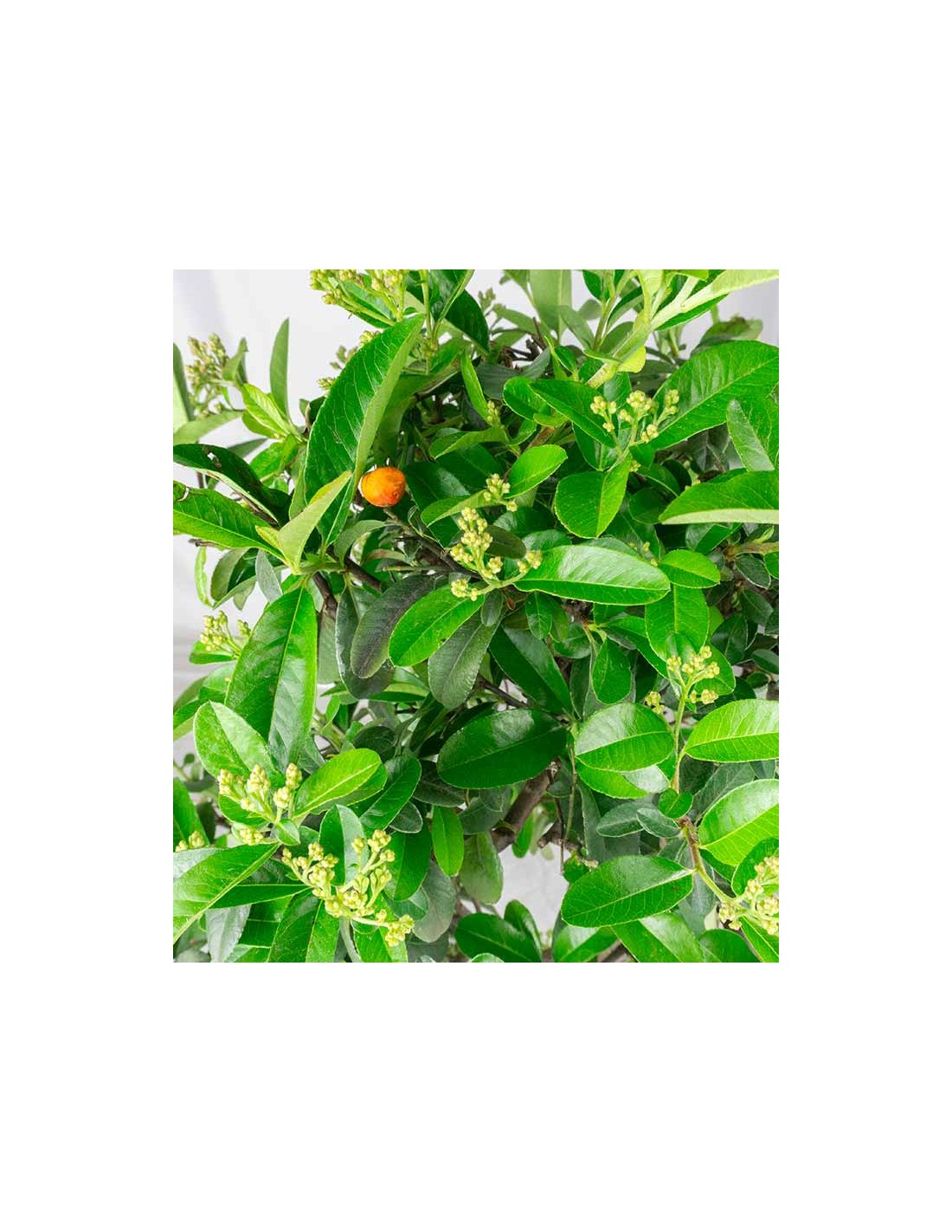 La Pyracantha è un arbusto sempreverde caratterizzato da foglioline molto piccole e verde scuro, dalla forma ovale e ben delineata che si sviluppano su rami spinosi.