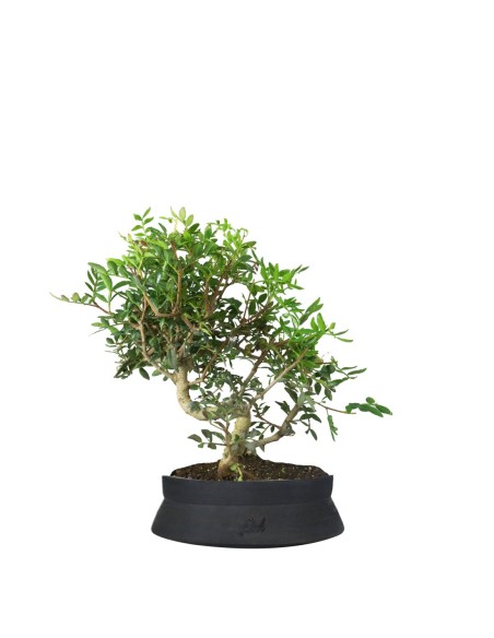 Pistacia lentiscus: si tratta di un arbusto sempreverde proveniente dall'area mediterranea. E' un'essenza abbastanza rustica e resistente e di facile coltivazione, quindi adatta anche a chi si approccia per la prima volta al mondo dei bonsai. Presenta un tronco marrone chiaro, la cui corteccia è lievemente grinzosa. La resina contenuta al suo interno è usata fin dall'antichità per produrre un mastice gommoso e ancora oggi la pianta viene utilizzata in erboristeria e nell'industria dei profumi. Le foglie, ovali e di colore verdastro del pistacia lentiscus sono altamente profumate. All'inizio della primavera all'ascella fogliare sbocciano piccoli fiorellini riuniti in racemi che poi in estate lasciano il posto ai frutti, delle bacche tondeggianti di colore rosso, che divengono nere a maturazione, in inverno. Mentre il tuo bonsai si adatterà al nuovo ambiente, fermati a osservarlo, impara ad averne cura e a conoscerlo.