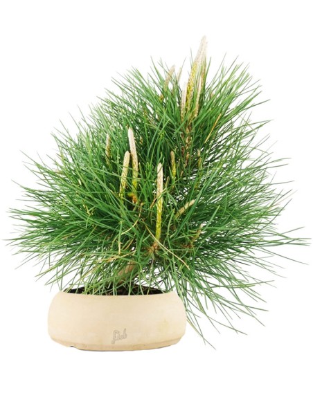 Chiamato comunemente 'pino nero giapponese', questo bonsai è apprezzatissimo per i suoi palchi e il suo tronco, che crescendo assumono forme contorte molto scenografiche, e per la sua relativa facilità di coltivazione. Le foglie sono dure, aghiformi e raggruppate a due a due. Il loro bel colore verde scuro crea un piacevolissimo contrasto con il marrone-crema dei rami e il bianco-grigio delle gemme terminali di ogni tralcio. Il Pinus thunbergii, chiamato così in onore del fisico svedese del 18° secolo Carl Peter Thunberg, è una delle piante più indicate per la coltivazione a bonsai e, anche in vaso, mostra una straordinaria longevità riuscendo a vivere anche per centinaia di anni. Adatta anche ai neofiti, questa pianta ha bisogno di una posizione luminosa e ventilata, di innaffiature regolari, aspettando che la terra si asciughi completamente prima innaffiare di nuovo, e di un buon concime organico specifico per bonsai da marzo fino a ottobre ogni 15 giorni. Seguendo queste semplici indicazioni crescerà sano e rigoglioso regalandoti una piccola oasi zen all'interno di casa tua.