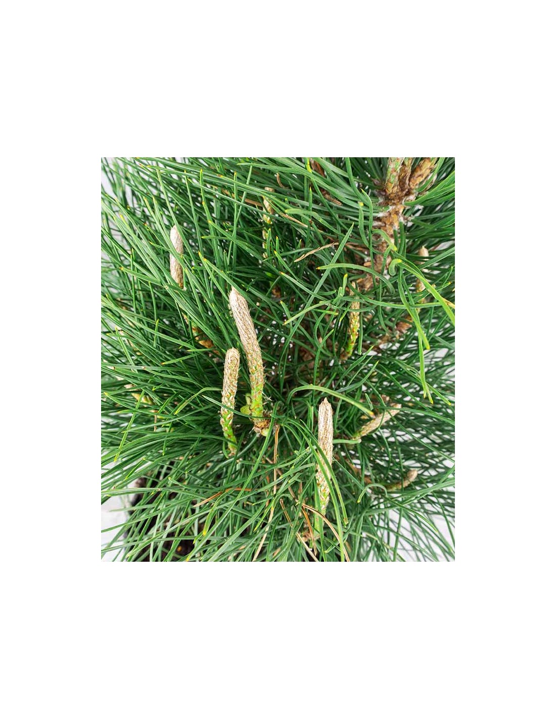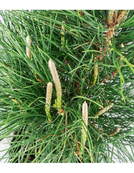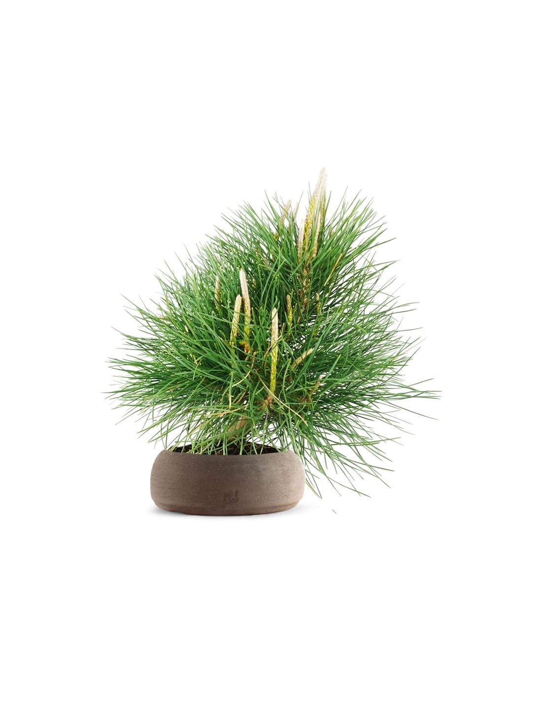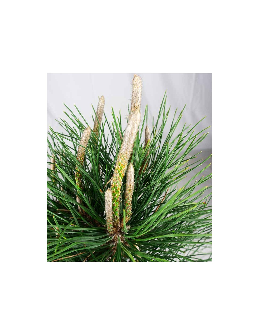 Chiamato comunemente 'pino nero giapponese', questo bonsai è apprezzatissimo per i suoi palchi e il suo tronco, che crescendo assumono forme contorte molto scenografiche, e per la sua relativa facilità di coltivazione. Le foglie sono dure, aghiformi e raggruppate a due a due. Il loro bel colore verde scuro crea un piacevolissimo contrasto con il marrone-crema dei rami e il bianco-grigio delle gemme terminali di ogni tralcio. Il Pinus thunbergii, chiamato così in onore del fisico svedese del 18° secolo Carl Peter Thunberg, è una delle piante più indicate per la coltivazione a bonsai e, anche in vaso, mostra una straordinaria longevità riuscendo a vivere anche per centinaia di anni. Adatta anche ai neofiti, questa pianta ha bisogno di una posizione luminosa e ventilata, di innaffiature regolari, aspettando che la terra si asciughi completamente prima innaffiare di nuovo, e di un buon concime organico specifico per bonsai da marzo fino a ottobre ogni 15 giorni. Seguendo queste semplici indicazioni crescerà sano e rigoglioso regalandoti una piccola oasi zen all'interno di casa tua.
