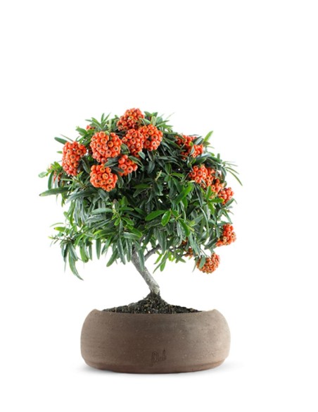 Il bonsai di Pyracantha è una pianta da esterno sempreverde molto resistente; infatti, è consigliata nei primi passi nel mondo del bonsai in quanto resiste bene anche in caso di errori durante la coltivazione. È una pianta che deve essere sottoposta ad alcune importanti cure per vegetare al meglio e mantenere il suo splendido aspetto: in primavera, va posizionata all'esterno, in una zona luminosa (come un balcone o terrazzo) in pieno sole, che potrà stimolarne la fioritura e di conseguenza la produzione di frutti; durante il periodo estivo, invece, la vostra pyracantha è bene posizionarla in un luogo in cui vi è metà giornata sole e metà ombra. Nel periodo invernale può stare tranquillamente all'esterno, l'unica accortezza è quella di riparare le radici nel caso in cui ci si trovi in località in cui è frequente andare a temperature sotto zero. La pyracantha, trattandosi di una pianta sempreverde dovrà essere annaffiata tutto l'anno, con azioni regolari, quando il terreno risulta asciutto. La potatura si può effettuare da Gennaio ad Aprile, mentre, il rinvaso si effettua con periodicità di circa 2 - 3 anni. La concimazione della pyracantha va eseguita come tutte le piante, dalla Primavera all'autunno ogni due/tre settimane e sospenderla in fase di fioritura.