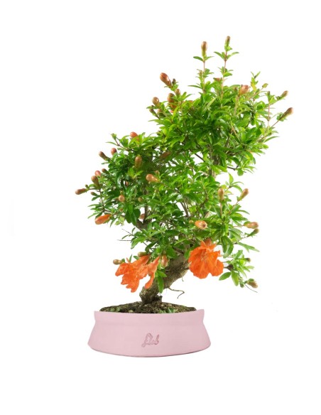 Il nostro bonsai di melograno ha 9 anni e un'altezza di 40 cm. Il vaso in cui è contenuto è un artigianale prodotto in Italia a Marchio FLOB in terracotta, trattato per resistere al freddo e all'acqua. Questo lo rende perfetto per essere tenuto all'aperto, anche durante l'inverno, senza temere per la sua salute.