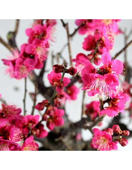 Originario della Cina, il Prunus Mume è considerato il bonsai del principiante. Caratteristica del tronco è l'aspetto vetusto, ingrigito e rugoso, mentre la chioma è costellata da foglie piccole e dentellate che si inframmezzano ai fiori bianchi, rosa pallido o di un rosso intenso. I frutti sono costituiti da drupe tondeggianti che ricordano l'albicocca, utilizzate in Giappone come base per produrre una bevanda estiva rinfrescante. Il Prunus mume fiorisce in Italia in primavera esattamente come il mandorlo. Seguendo le giuste cure, avrete una pianta sofisticata capace di conferire atmosfere zen alla tua casa.