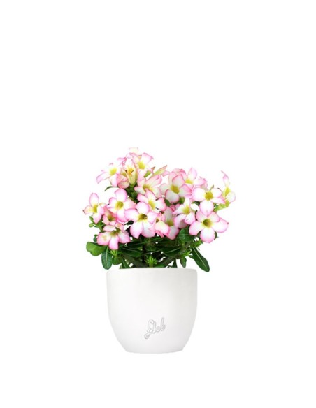 I suoi fiori possono assomigliare a un oleandro e proprio per questo viene chiamata anche “oleandro del Madagascar”. Si tratta però, a tutti gli effetti, di una succulenta! La sua bellezza è straordinaria: gli stessi fiori sono molto appariscenti e composti da 5 petali che si sviluppano da un'ovario “a imbuto”, di colore giallo all'interno. In questa varietà la troviamo in vaso 14 e fiori rosa che sfumano verso il bianco, con un tronco meno voluminoso rispetto agli altri adenium, ma comunque ugualmente affascinante grazie alla sua striatura biancastra superficiale. L'aspetto che la fa da padrone nella Adenium è proprio la bellezza dei fiori, che si sviluppano in gran quantità dalla primavera all'autunno e quasi non lasciano intravedere le foglie sottostanti. Durante l'inverno tende a spogliarsi quasi completamente delle foglie, per poi generare nuovi germogli prima dell'arrivo della primavera.