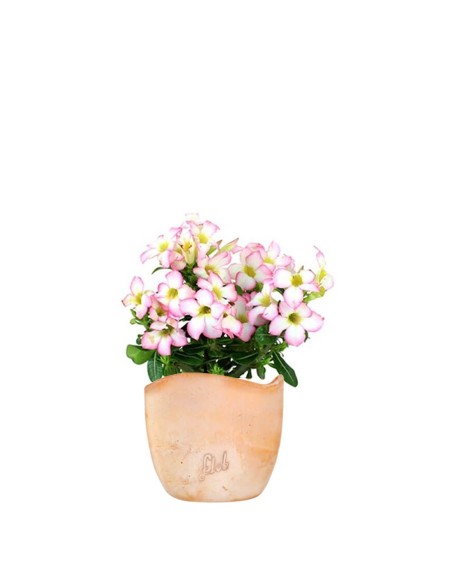 I suoi fiori possono assomigliare a un oleandro e proprio per questo viene chiamata anche “oleandro del Madagascar”. Si tratta però, a tutti gli effetti, di una succulenta! La sua bellezza è straordinaria: gli stessi fiori sono molto appariscenti e composti da 5 petali che si sviluppano da un'ovario “a imbuto”, di colore giallo all'interno. In questa varietà la troviamo in vaso 14 e fiori rosa che sfumano verso il bianco, con un tronco meno voluminoso rispetto agli altri adenium, ma comunque ugualmente affascinante grazie alla sua striatura biancastra superficiale. L'aspetto che la fa da padrone nella Adenium è proprio la bellezza dei fiori, che si sviluppano in gran quantità dalla primavera all'autunno e quasi non lasciano intravedere le foglie sottostanti. Durante l'inverno tende a spogliarsi quasi completamente delle foglie, per poi generare nuovi germogli prima dell'arrivo della primavera.