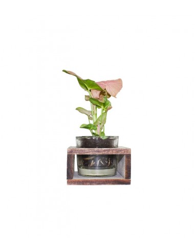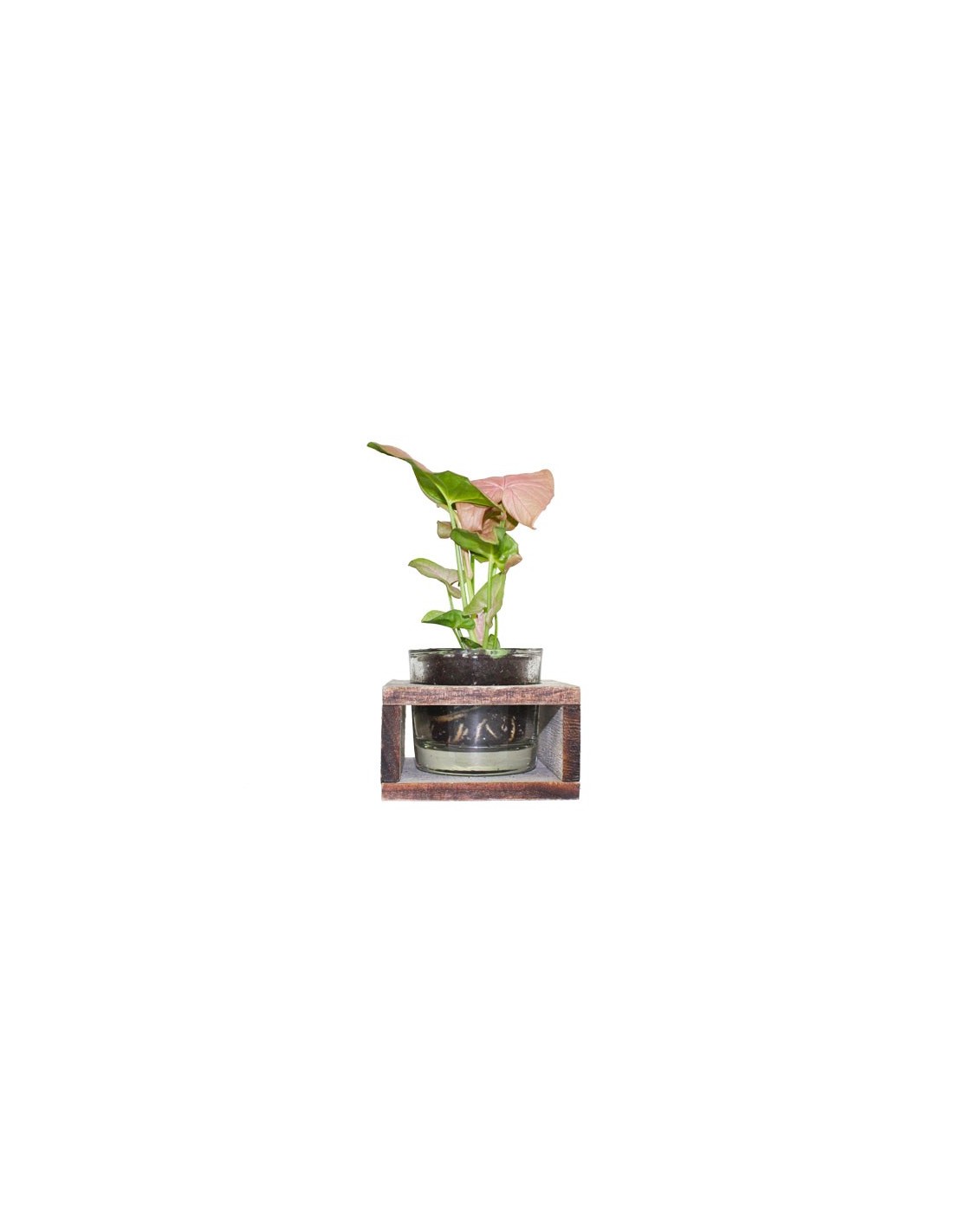 Una piccola pianta di Singonio rosa inserita all'interno di un vasetto in vetro sorretto da un supporto in legno che gli conferisce un aspetto rustico e naturale. Le foglie eleganti sono caratterizzate dalla forma a cuore e da un colore rosa pastello. Un oggetto ornamentale in grado di donerà un tocco di stile alla vostra casa. Un complemento d'arredo originale che rende questa pianta di Singonio ideale per essere inserita in qualsiasi ambiente, da sola oppure abbinata ad altri vasetti della stessa collezione. L'effetto sarà davvero molto decorativo e scenico!