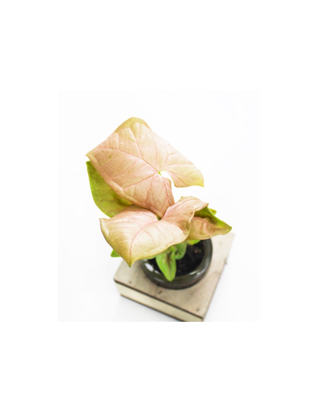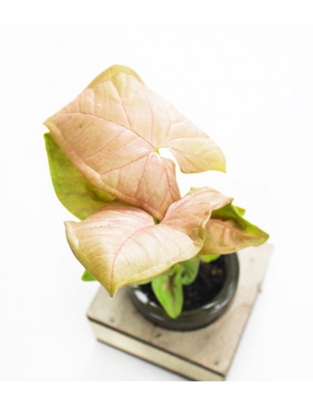 Questa pianta non richiede particolari cure se non quella di bagnare leggermente la terra quando risulta ben asciutta. Il vaso non ha un foro per il drenaggio, perciò bisognerà fare attenzione ad evitare il ristagno d'acqua. Il Singonio rosa ama la luce indiretta e temperature costanti, al riparo da condizionatori o termosifoni.