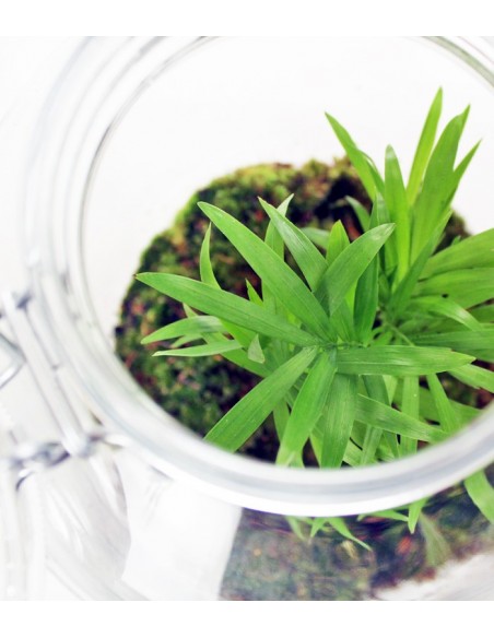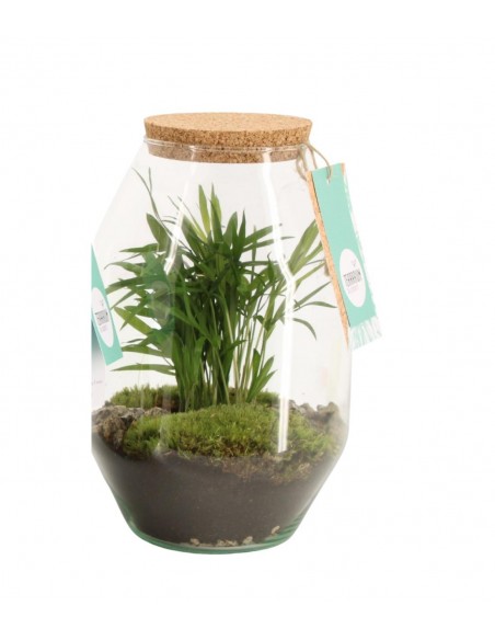 La Chamadorea è una pianta originaria del Messico e del Guatemala e comunemente conosciuta anche con il nome di palma nana o “palma della fortuna”. Nel suo habitat naturale cresce come pianta da sottobosco nelle dense foreste pluviali, raggiungendo notevoli dimensioni, anche 10m. Presenta un fusto unico, eretto, e foglie pinnate riunite in gruppi alterni. Il tocco di classe della Chamadorea è fornito proprio da questo elegante fogliame di colore verde intenso che contribuisce a donarle un aspetto esotico. Oltre alla finalità decorativa, come altre piante della stessa famiglia, contribuisce anche a depurare l'aria degli ambienti interni in cui si trova. Esposta all'interno di questo barattolo in vetro, questa palma diventa preziosa come se fosse un pezzo da museo. Un complemento d'arredo dall'indiscusso effetto scenico, in grado di donare un tocco di stile alla vostra casa. Il vaso che contiene la Chamadorea è sigillato ermeticamente e al suo interno vengono ricreate le condizioni ottimali per la crescita della pianta stessa, riciclando continuamente l'acqua e l'aria interna, imitando i biotopi naturali molto umidi. L'unica cosa di cui ha bisogno è un po' d'amore e un bel luogo in cui vivere! L' ideale sarebbe lontano da fonti di luce diretta e dove la temperatura è costante. Un indicatore affidabile per la buona posizione è la quantità di condensa che si crea sul vetro. La condizione perfetta sarebbe quella di avere un lato coperto e l'altro no. Nel caso in cui la condensa fosse presente in quantità elevata basterà aprire il vostro contenitore e toglierla con un panno asciutto.