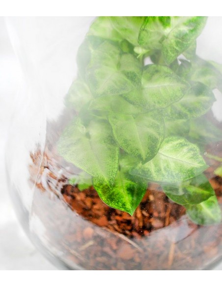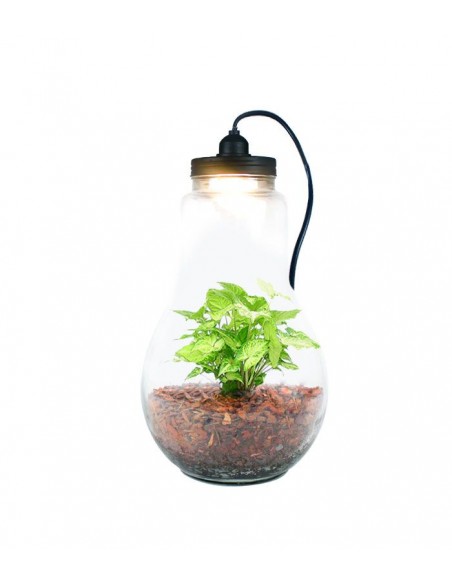 In questo caso, all'interno della lampada in vetro, illuminata e impreziosita da una luce calda, troviamo una pianta di Singonio. Si tratta di un sempreverde il cui fogliame presenta colori accessi e brillanti. Sviluppa radici aeree e foglie che cambiano aspetto nel corso della crescita: a pianta giovane sono piccole e sagittate; con la crescita invece si dividono in tre lobi e con un picciolo protettivo alla base. Grazie all'aspetto bizzarro e particolare, questo terrario rappresenta un vero e proprio elemento di design che è possibile inserire in qualsiasi contesto con risultati sempre apprezzabili.