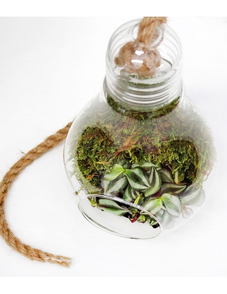 Tradescantia e muschio in composizione all'interno di una lampadina di vetro da appendere o da appoggio.