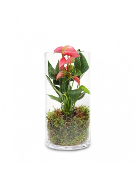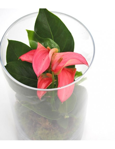 Conosciuto anche come fiore dell'amore, l'anthurium è una pianta sempreverde di origine tropicale la cui longevità e resistenza l'hanno resa uno degli esemplari più diffusi nelle nostre case. La sua particolarità risiede nelle foglie, cuoriformi e di colore verde scuro, coriacee e lucide. Spesso è la spata colorata ad essere erroneamente considerata il fiore, questi ultimi sono invece racchiusi nello spadice, piccolissime “pannocchie” di colore giallo/bianco. In questo caso ritroviamo l'anthurium in una composizione in vetro che è una vera e propria dichiarazione di stile. Un complemento di design dall' effetto wow, adatto a qualsiasi angolo di casa. Capace di evocare atmosfere esotiche e misteriose, diviene un regalo insolito e curioso, che oltretutto porta con sè un messaggio profondo. Nel linguaggio dei fiori infatti, l'anthurium rappresenta il simbolo di un legame sincero di amore e amicizia. Oltre a ciò, questa pianta ha un'altra importante caratteristica, ossia è in grado di filtrare le tossine dell'ambiente in cui vive, pulendo l'aria che respiriamo. Cosa volere di più?