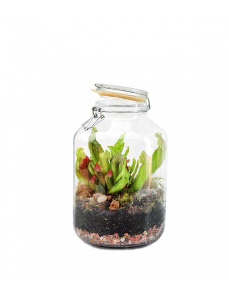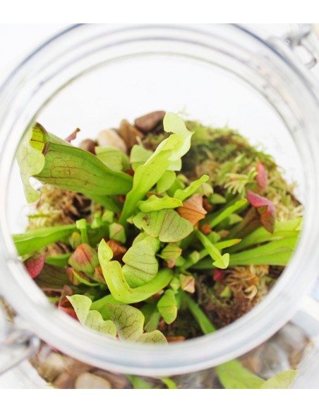 Una pianta curiosa e molto decorativa che assume una connotazione ancor più particolare perché inserita all'interno di questo vaso in vetro, un oggetto d'arredamento quasi poetico. Si tratta di un vero e proprio ecosistema in miniatura completamente autonomo, all'interno del quale si ricreano le condizioni ottimali di crescita per la pianta stessa, riciclando continuamente l'acqua e l'aria interna, imitando i biotopi naturali molto umidi.
