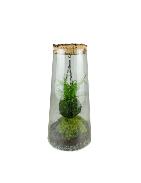 Caratteristiche: kokedama stabile in terrario di vetro, con muschio vivo e pianta ornamentale a bassa manutenzione.