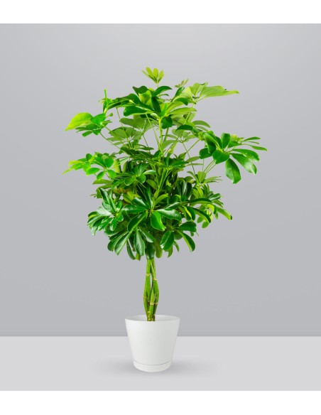 Questa varietà di Schefflera Arboricola che vi presentiamo è alta circa 90 cm e si presenta con una chioma folta e un tronco intrecciato, con tonalità di verde intenso che creano un bellissimo punto focale adatto soprattutto per arredi in stile boho o più rustici, in cui i colori caldi del legno e dei tessuti grezzi creano un piacevole contrasto.