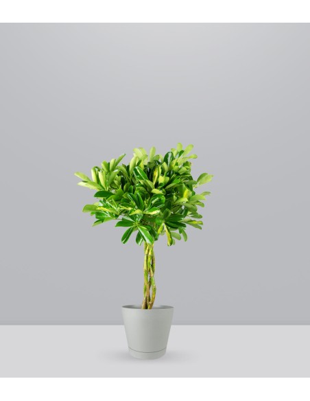 Questa pianta da interno ha un bellissimo tronco intrecciato color giallo-verde, e foglie variegate e lucide che donano colore agli ambienti.