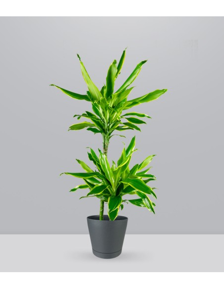 La nostra Dracena presenta due fusti di altezza differente che con le chiome disposte a rosa sulla sommità, creano un effetto visivo dinamico e vivace.